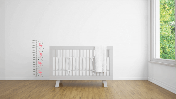 מד גובה לחדר ילדים באורך 150 ס"מ עם 4 מדבקות פלמינגו ומדבקות כוכבים מלאים וחלולים.