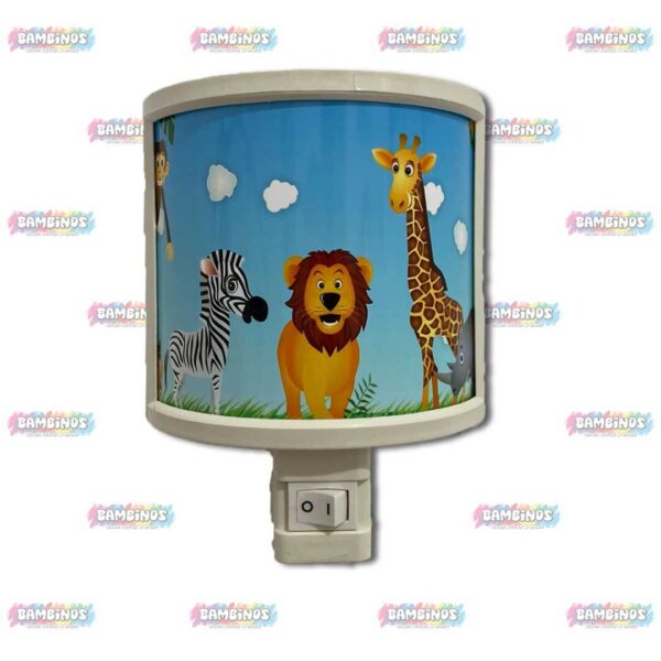 מנורת לילה מעוצבת עם איור של חיות בטבע על רקע שמיים המתחברת ישירות לשקע הקיר בחדר הילדים.