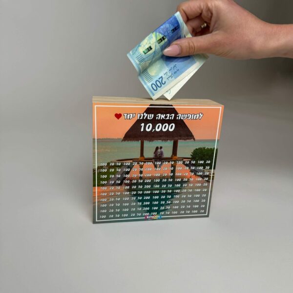 קופת חיסכון גדולה מעץ בצורת ריבוע עם 2 תמונות בעיצוב אישי- תמונה קדמית עליה כתובים: משפט בהתאמה אישית, הסכום לחיסכון- 10,000₪ ולוח סכומים קטנים של שטרות 20,50,100,200 – לאחר כל סכום כסף שמכניסים לקופה מוחקים ומתקדמים אל עבר היעד! ותמונה אחורית לבחירתכם.