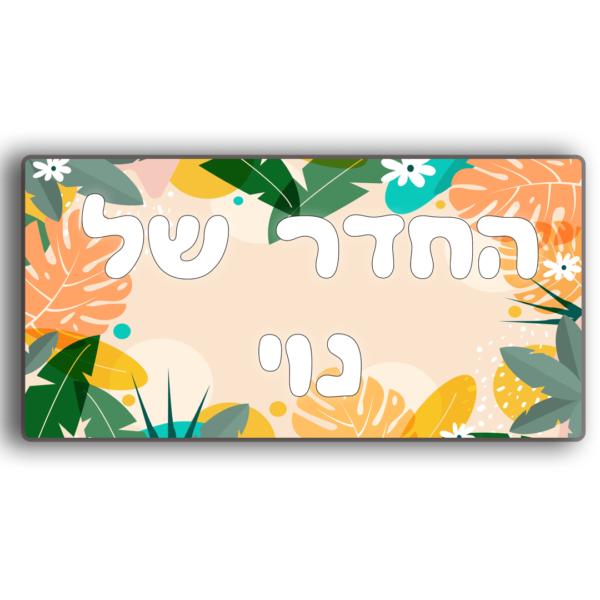 שלט לדלת חדר ילדים- "החדר של…" עם שם הילד/ה על רקע בהיר עם מגוון סוגי עלים בכל מיני צבעים.